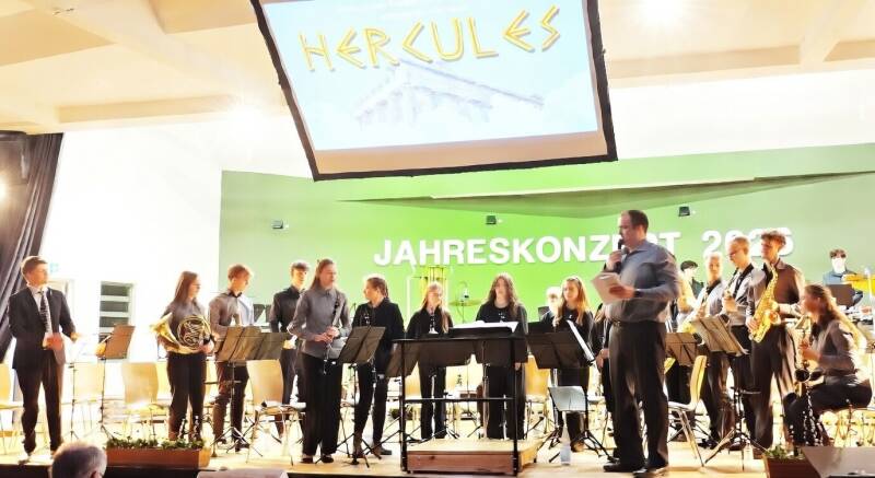 Darauf folgte das Jugendblasorchester, letztmals unter der Leitung von Marius Schäfer. Neuer Leiter wird Lucas Mallebré (links im Bild). Das Jugendblasorchester spielte die Stücke "Celebration and Song" von R. Sheldon, "Trag mi Wind" von Christian Dreo und "Hercules" von Alan Menken. Die jungen Leute hatten sich zum Abschied von ihrem langjährigen Leiter Marius Schäfer eine Überraschung einfallen lassen und einheitlichen Hoodies (Kaputzenpullis) mit einem originellen Spruch auf dem Rücken angeschafft.