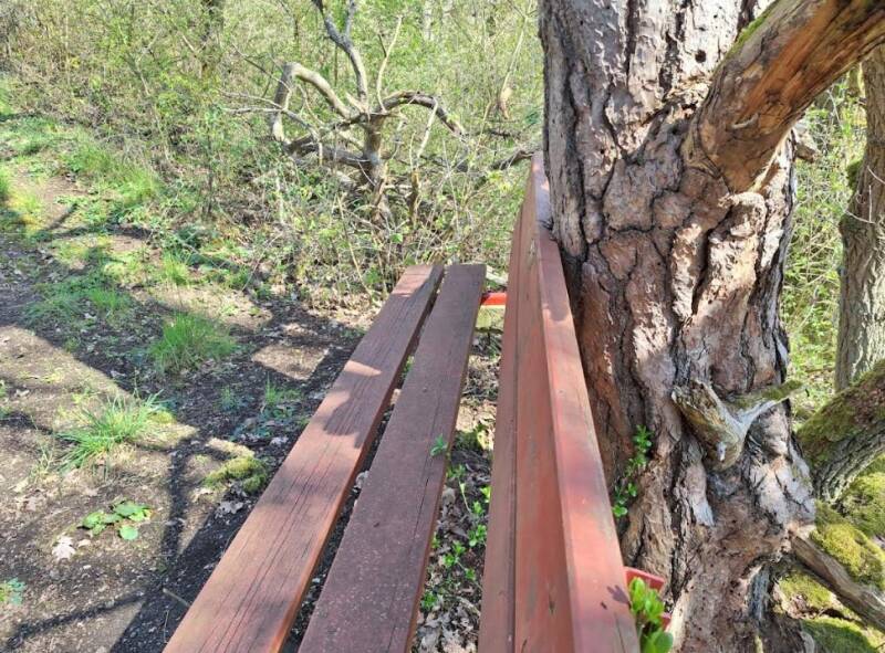 Osterwochenende haben wir festgestellt, dass der schon seit längerem marode Baum am Ansbacher Kreuz inzwischen tatsächlich nur noch von unserer Ruhebank gehalten wird.