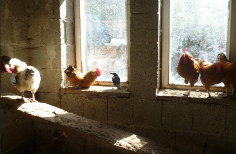 Im Hühnerstall genießen die Hühner die Sonnenstrahlen